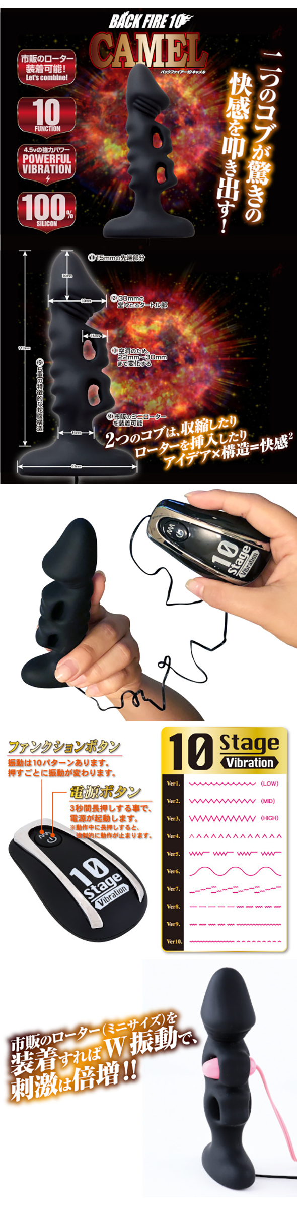 その名も「バックファイアー10 CAMEL(キャメル)」強力な振動と独創的な形状が、貴方を攻めまくる!!バックファイアーCAMEL(キャメル)、2つのコブは30mmの高さがあり、挿入時には収縮し22mmまで縮小します。