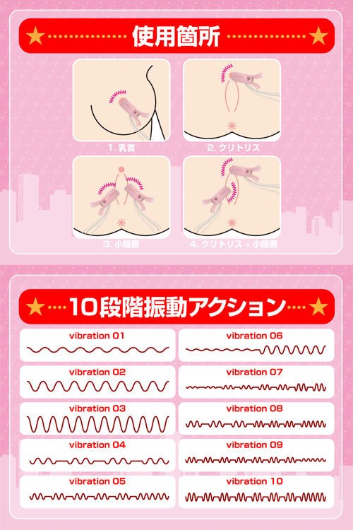 振動パターンは10種類。シリーズ品共通の静音かつパワフルな刺激で乳首を責めます。