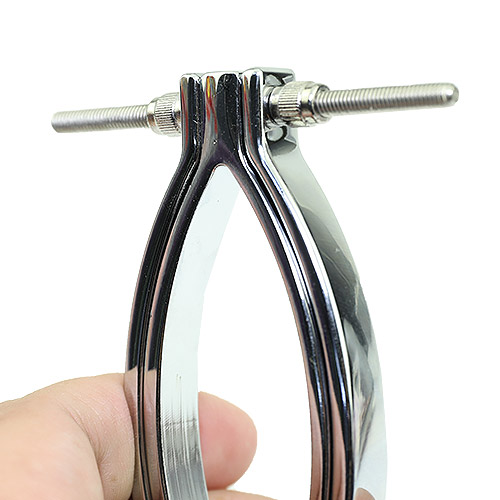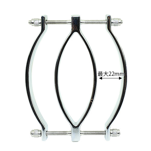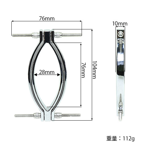 本グッズを当て、ネジを緩める。可動部分に大陰唇を挟み込み、ネジを締めて固定するというもの。